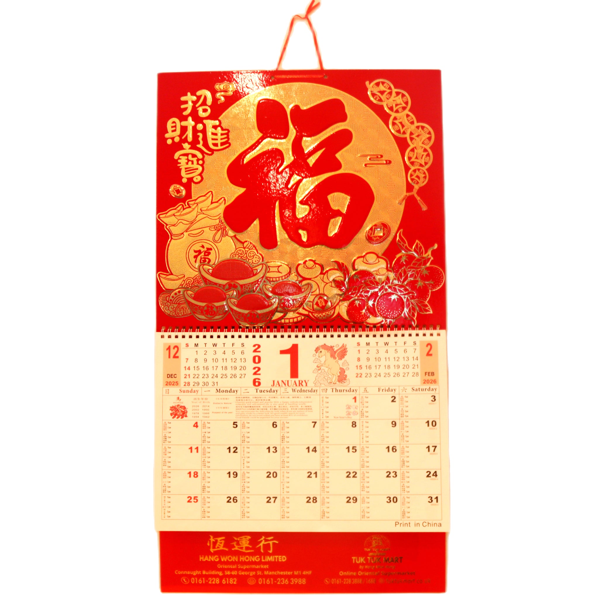 Celebrate the Year of the Snake with this striking 2026 Chinese Calendar featuring the auspicious phrase 招財進寶 – "Attract Wealth and Prosperity." The large format showcases traditional Chinese calligraphy and lunar dates alongside the Gregorian calendar, making it an essential reference for tracking both systems. Perfect for homes, offices, or cultural spaces, this calendar combines aesthetic appeal with practical functionality. Each month displays vibrant imagery and cultural significance, honouring time-honoured traditions whilst keeping you organised throughout the year. An ideal gift for those who value Chinese heritage and good fortune.