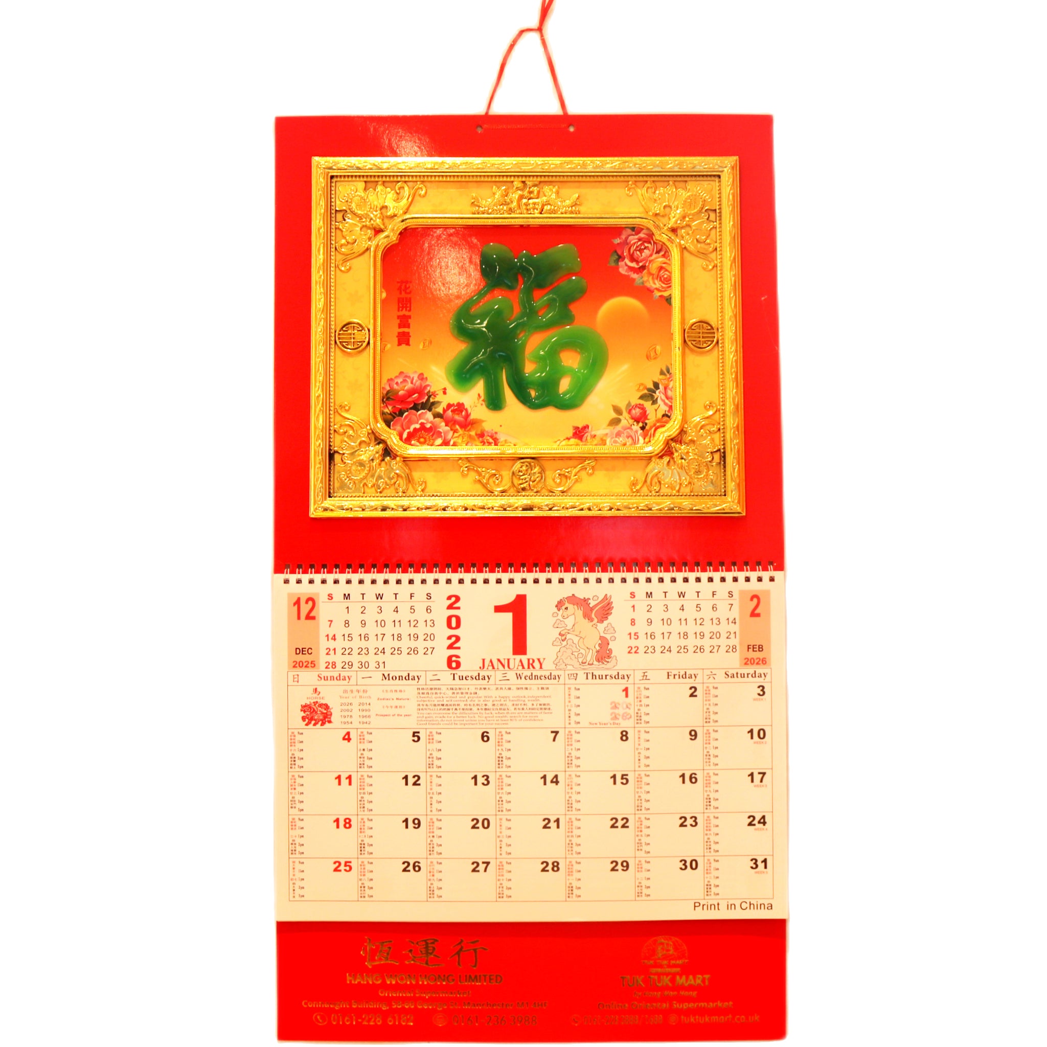 Welcome the Year of the Horse with this striking 2026 Chinese Calendar featuring the auspicious "綠色玉福 " (Blooming Wealth and Prosperity) design. The large format showcases traditional floral motifs symbolising abundance and good fortune throughout the year. Enhanced with an intricate 3D 福 (Fu/Blessing) character that adds dimensional elegance to your space, this calendar seamlessly blends cultural heritage with contemporary aesthetics. Perfect for homes and offices seeking to honour Chinese traditions whilst maintaining modern décor sensibilities. An ideal gift for those who appreciate meaningful, artfully crafted pieces.