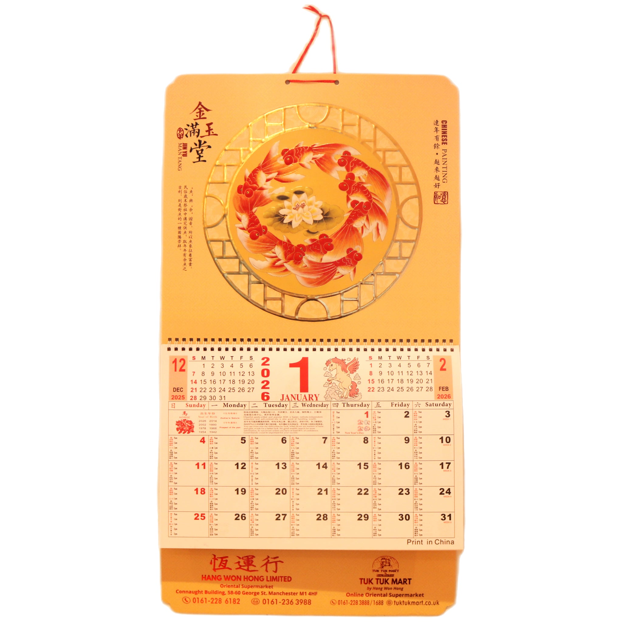 Celebrate the Year of the Horse with this distinguished 2026 Chinese Calendar, prominently featuring a goldfish painting alongside the auspicious inscription 金玉滿堂 (prosperity and abundance). The large format showcases exquisite traditional Chinese brush-work, with the goldfish motif symbolising wealth and good fortune in classical Chinese culture. This calendar merges artistic excellence with practical utility, making it an elegant addition to any space. The combination of symbolic imagery and refined painting technique appeals to collectors and those seeking meaningful cultural décor. An exceptional choice for gifting or personal display.