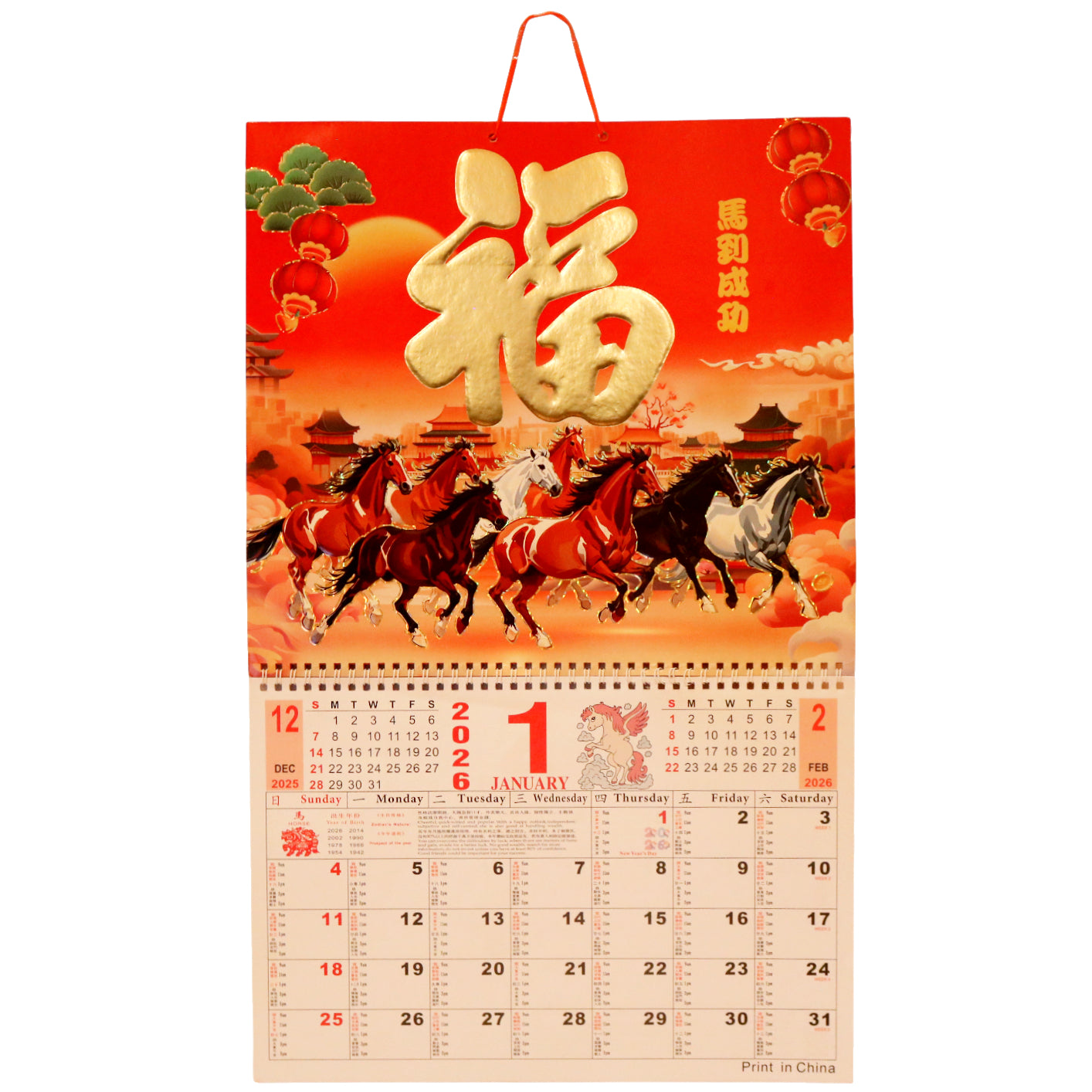 Celebrate the Year of the Horse with this striking 2026 Chinese Calendar featuring the auspicious phrase "馬到成功" (success comes swiftly). This large-format calendar combines traditional Chinese symbolism with practical monthly planning, making it an ideal choice for homes and offices. Each page showcases authentic calligraphy and cultural imagery that honours the lunar calendar's significance. Perfect for those seeking to blend cultural appreciation with everyday functionality, this calendar serves as both a decorative piece and an essential organisational tool throughout the year.