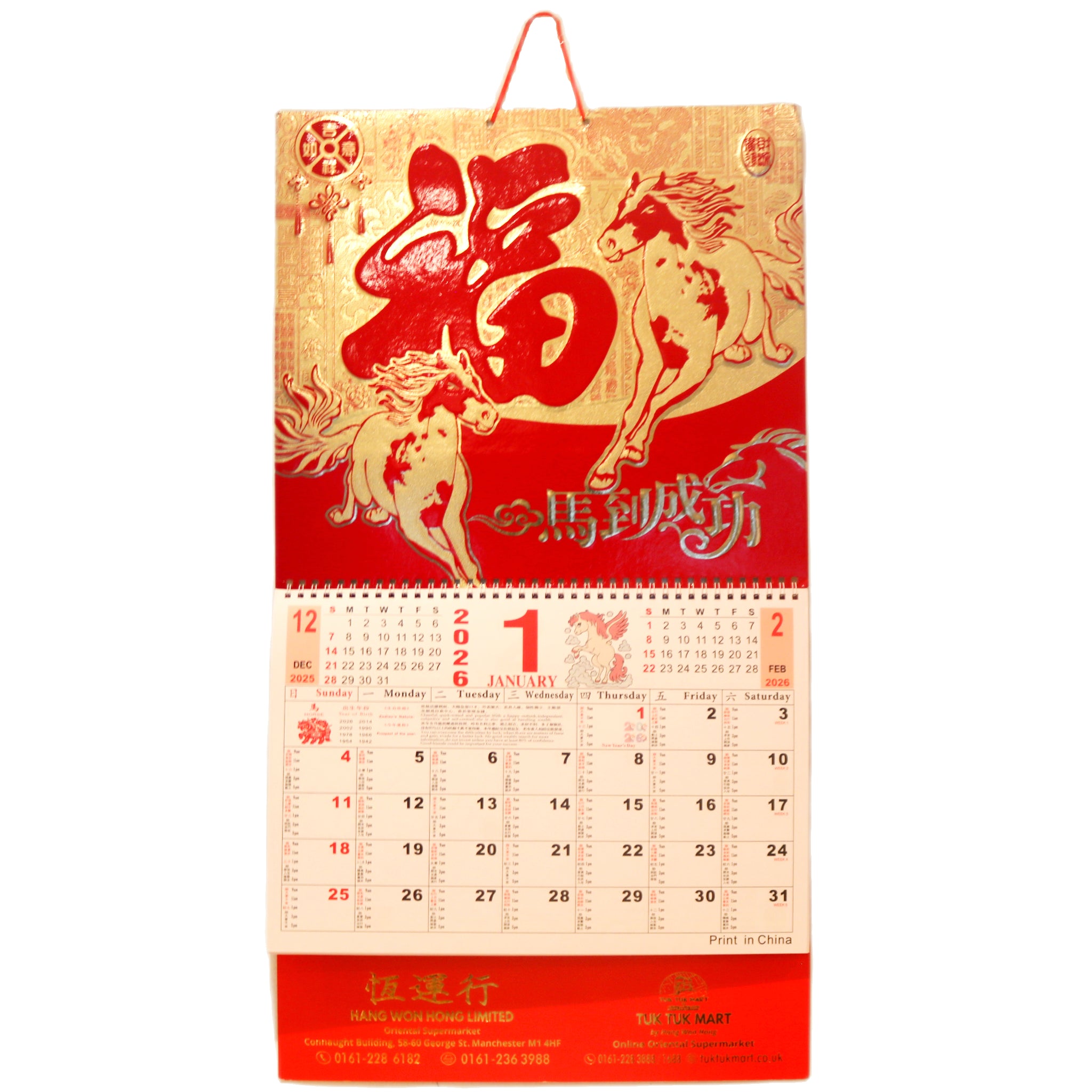 Celebrate the Year of the Horse with this striking 2026 Chinese Calendar featuring the auspicious phrase 馬到成功 (success comes swiftly). The large format showcases two dynamic running horses, symbolising prosperity, vitality, and forward momentum. Expertly designed with traditional Chinese aesthetics and modern clarity, this calendar combines cultural significance with practical monthly planning. Perfect for homes, offices, or as a thoughtful gift for those who appreciate Chinese heritage and symbolism.