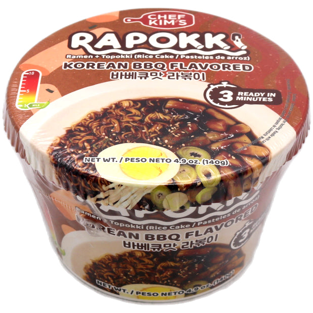 Description: Chef Kim's Rapokki Bowl (Ramen + Topokki) - Korean BBQ Flavour 140g. Experience the bold, authentic flavours of Korean BBQ with Chef Kim's Ramen + Topokki. This 140g package includes rice cakes and pasteles de arroz, creating a unique and satisfying fusion dish. Indulge in a delicious and convenient meal that will transport you to Korea with every bite.