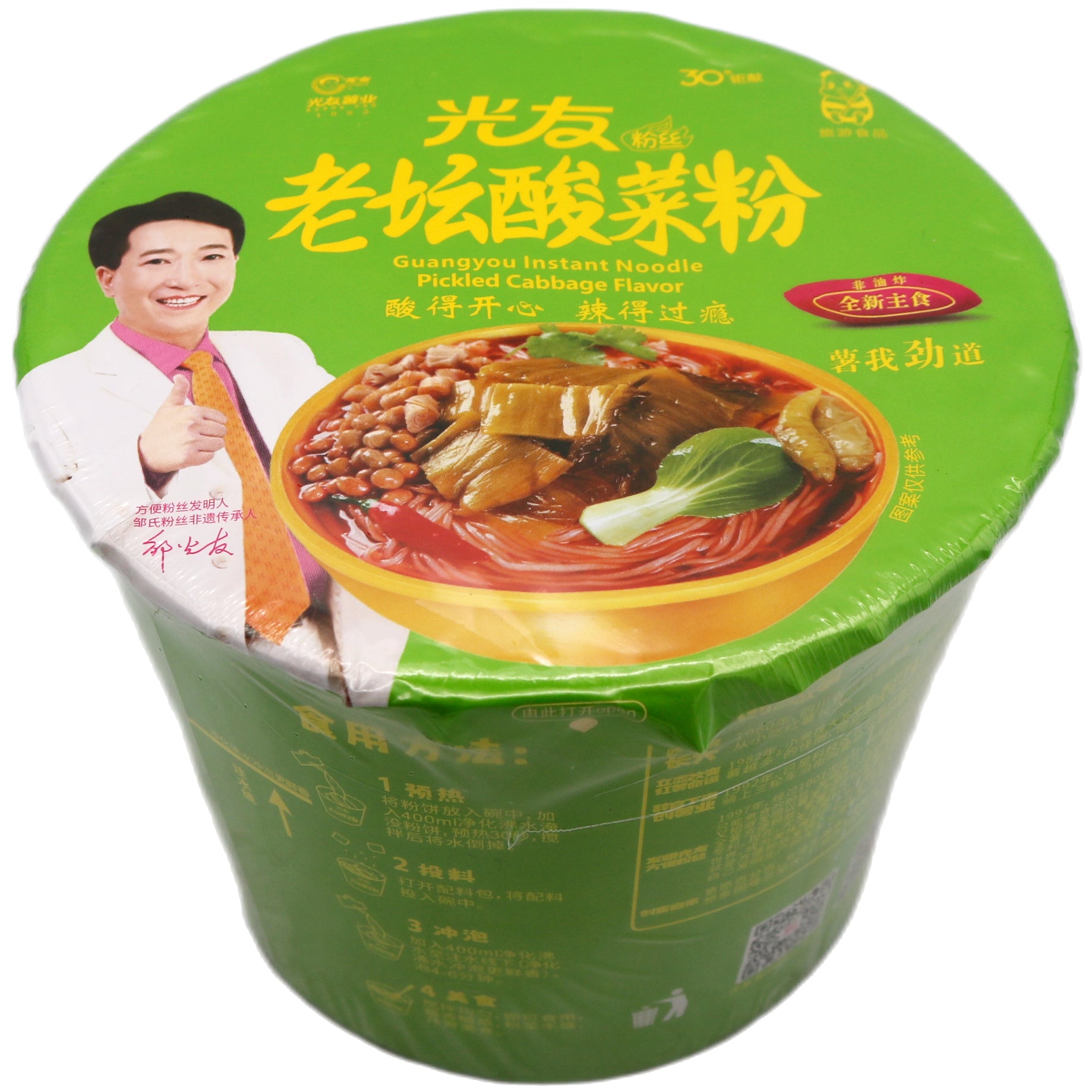 Description: Guang You Sweet Potato Instant Noodles Pickled Cabbage Flavour (Bowl) 光友粉絲碗裝 老坛酸菜粉 100g. Guang You's sweet potato noodles deliver authentic pickled cabbage flavour in a convenient bowl format. These 100g instant noodles combine tender vermicelli with tangy, umami-rich broth infused with traditional sour cabbage notes. The sweet potato base provides a subtle earthiness that complements the bold, fermented character of the seasoning. Ready in minutes, this bowl offers genuine Sichuan-style comfort without compromise. Ideal for those seeking genuine Asian instant noodle experiences with complex, layered flavours.