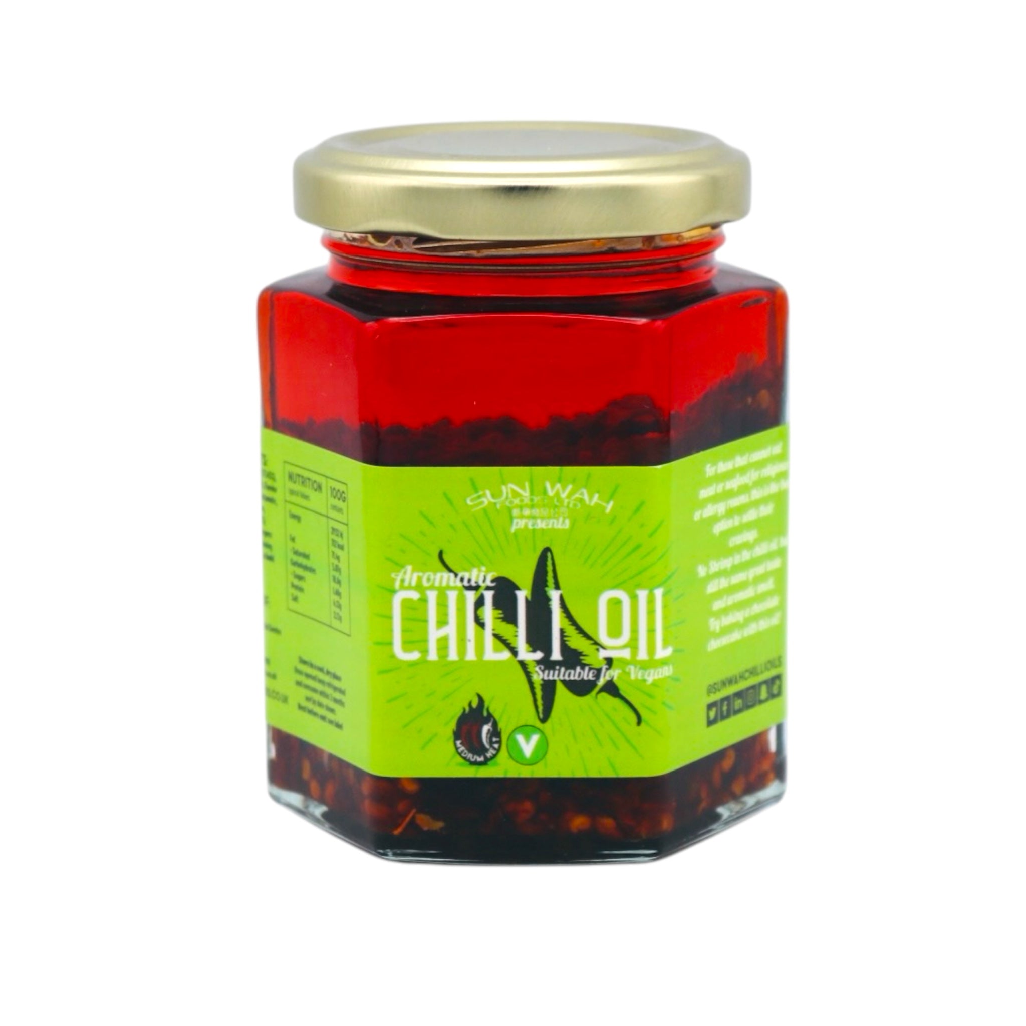 Description: Sun Wah Aromatic Chilli Oil 新華辣椒油 160g (Vegan). Discover the bold and spicy flavours of Sun Wah Aromatic Chilli Oil. Made with 100% vegan ingredients, this aromatic oil adds a kick to any dish. With its rich taste and unique blend of herbs and spices, it's perfect for dipping, cooking, or drizzling over your favourite meals. Experience the heat and flavour of Sun Wah Chilli Oil today.