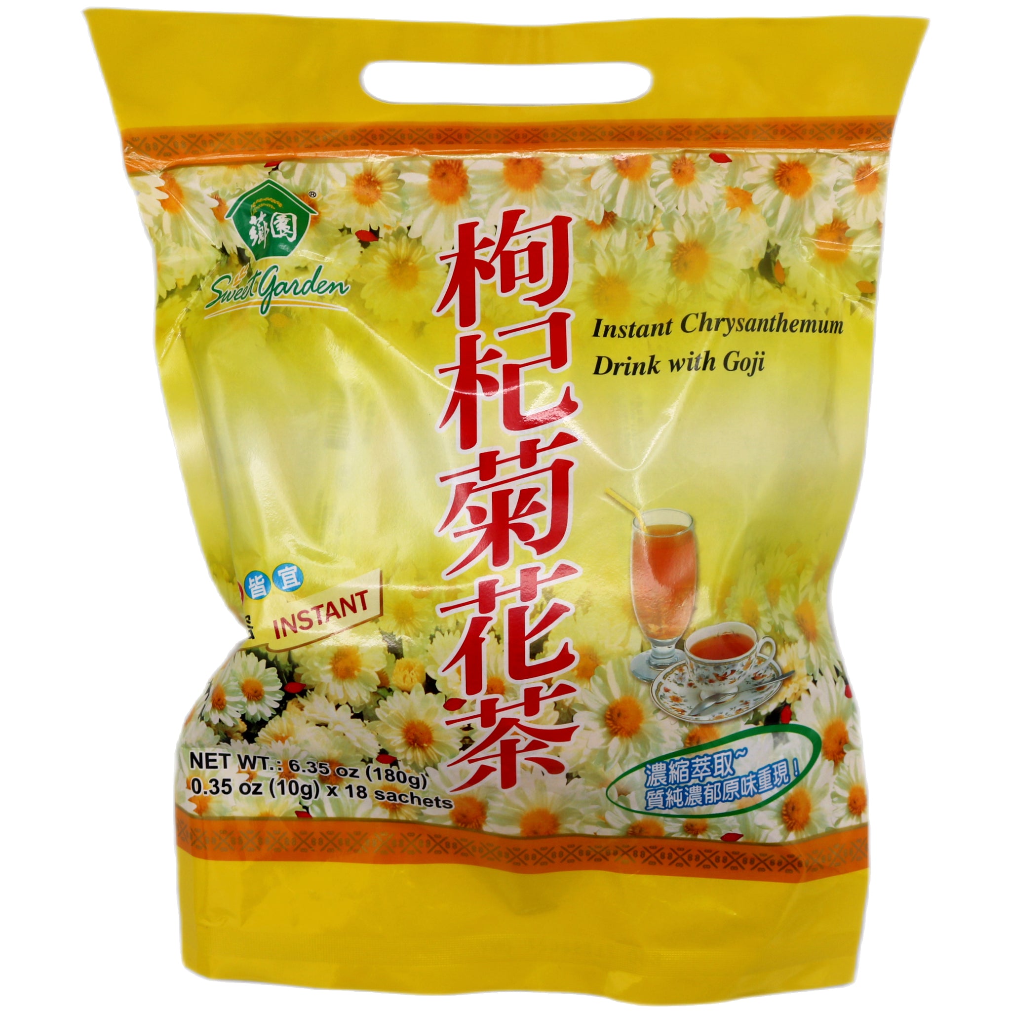 Description: Sweet Garden Instant Chrysanthemum Drink with Goji (10g*18pcs) 180g. Sweet Garden Instant Chrysanthemum Drink combines traditional chrysanthemum flowers with nutrient-rich goji berries in convenient single-serve sachets. Each box contains 18 individually portioned 10g packets, totalling 180g of premium blend. Simply steep in hot water for a soothing, aromatic beverage celebrated in Asian wellness traditions. Chrysanthemum is valued for its delicate floral notes and cooling properties, whilst goji berries add natural sweetness and antioxidants. Ideal for daily consumption, this instant format eliminates preparation time whilst maintaining the authentic taste and benefits of traditional herbal infusions. Perfect for those seeking a refined, healthful tea alternative.